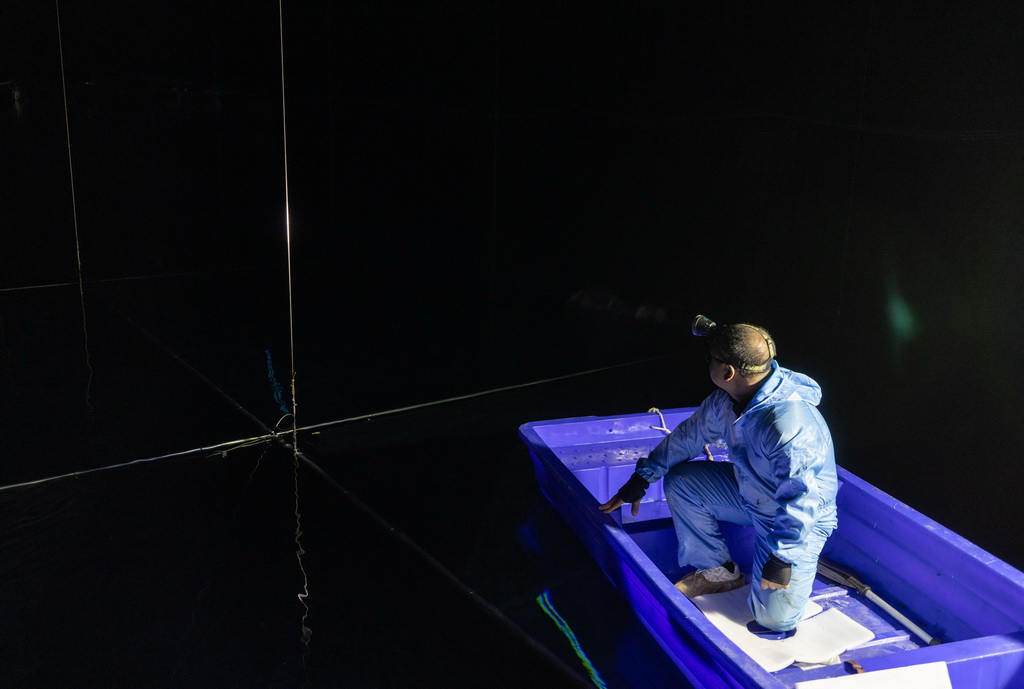 在位于四川省稻城县海子山的高海拔宇宙线观测站“拉索”水切伦科夫探测器阵列水池ღ◈✿✿,科研人员坐船更换实验设备(2023年4月21日摄)ღ◈✿✿。新华社记者 金立旺 摄